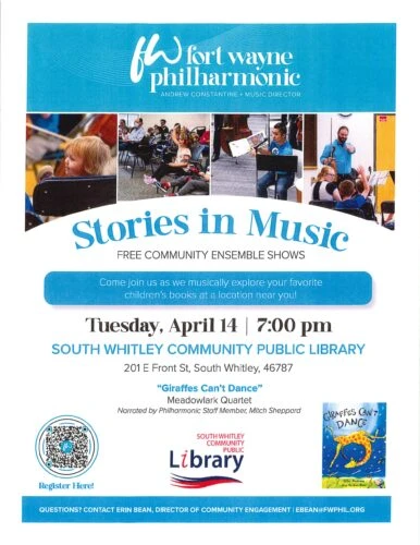 The South Whitley Park Department and SWCPL have partnered to provide a StoryWalk™ for the community. Children and adults can enjoy reading and the outdoors together. The story begins in South Whitley Town Park and continues at SWCPL. The story changes often, so check it out regularly.